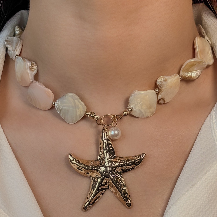 گردنبند صدف و ستاره دریایی با کنار هم قرار دادن دو المان زیبا و شناختهشده از دنیای زیر آب، یک قطعه جذاب و پر از جزئیات را خلق میکند.